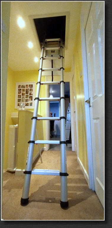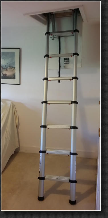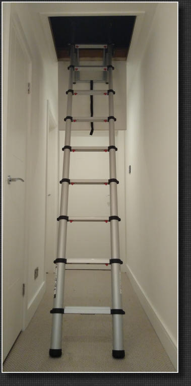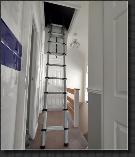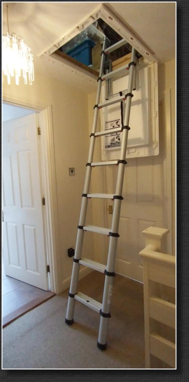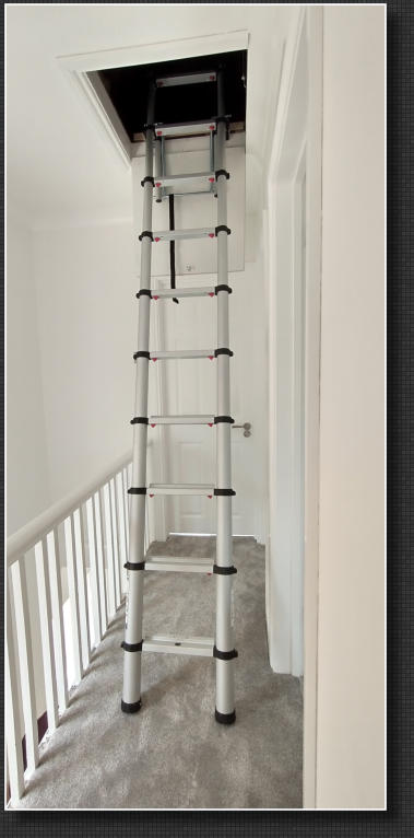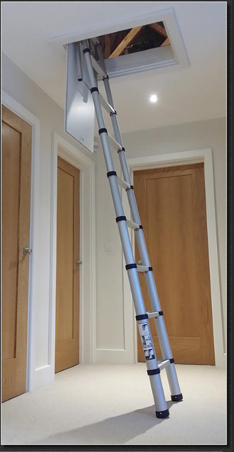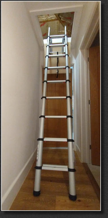 Quite heavy - 13kg, (around 27lb) to push up fairly high to clip over securing bar when stowing away. Our regular 2 section ladder weighs 5kg. Not quite as adjustable as our standard ladders, so not suitable for confined space on the landing e.g. in two bed terrace houses. Since the ladder doesn’t take up much loft space, it needs more hatch space, so it’s not suitable for loft openings under 55cm wide by 60cm deep. No handrail available due to the way the ladder telescopes down. If you’d like one of these we can fit it without a quote visit first. If it can’t be fitted we can fit a standard two-section ladder instead. Don’t forget either option will also need a drop-down hatch. More details on openings: click here